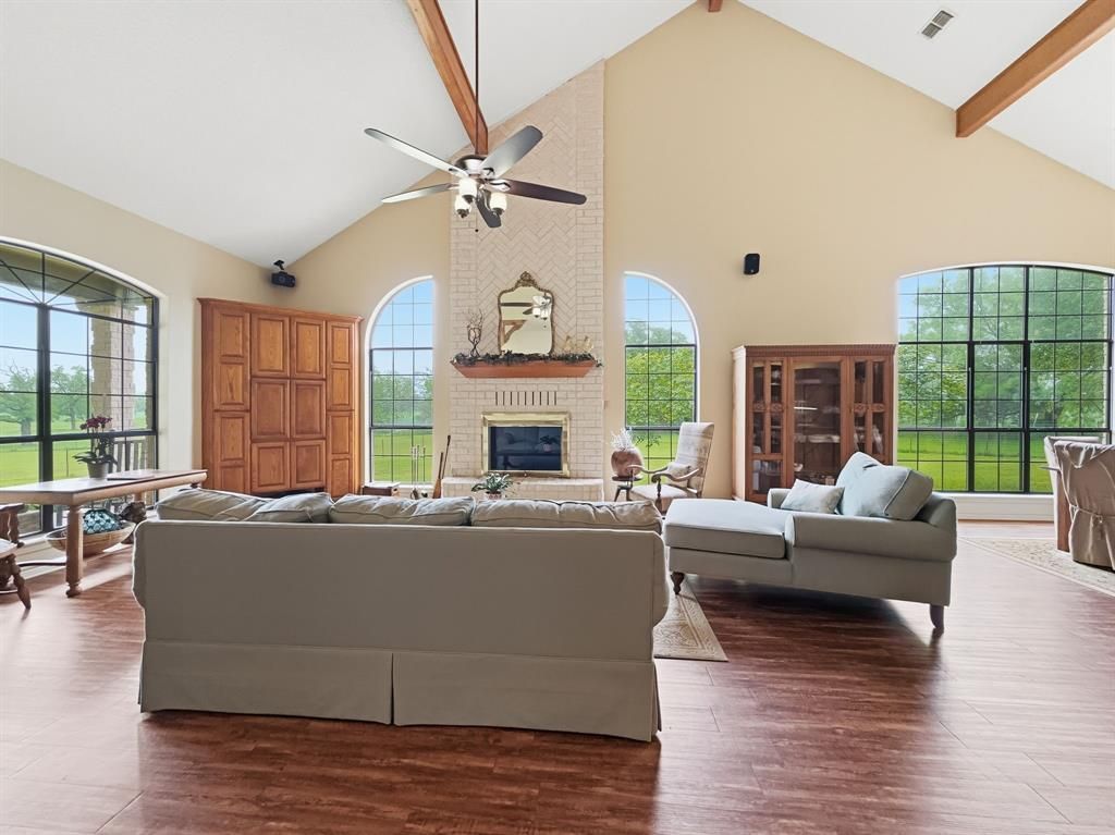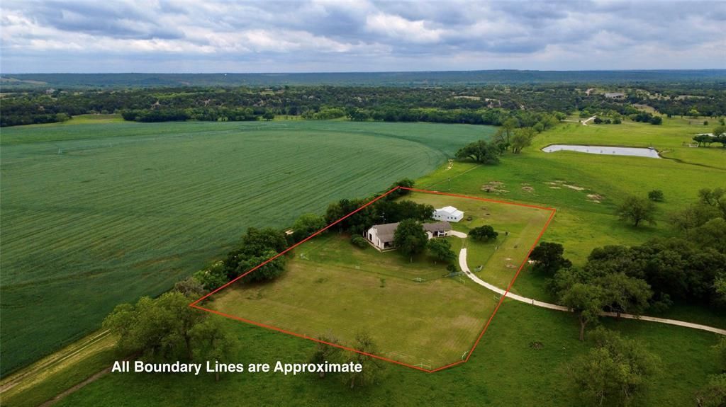 Nestled among mature oaks and pecan trees on 3.12 private acres, this beautifully maintained 3-bedroom, 2.5-bath brick home offers the feel of a secluded ranch retreat without the upkeep. The inviting open floor plan is anchored by a brick fireplace framed by soaring windows and exposed beams, filling the space with natural light. Gorgeous wood floors flow throughout, leading into a spacious kitchen with center island and abundant cabinetry, ideal for gathering and everyday living.The oversized primary suite features a large walk-in closet and en-suite bath. A bright den with walls of windows offers two sets of French doors opening to the attached carport. Enjoy peaceful mornings and relaxing evenings from the covered front and back porches.A 750 sq ft metal barn with two roll-up doors and a covered awning provides excellent workshop space, while additional outbuildings add flexibility and extra storage. Tucked away down a private easement drive, this property offers privacy, charm, and functionality in a truly serene setting.